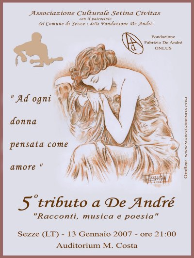 Circolo Culturale Setina Civitas presenta Tributo a Fabrizio De André sabato 13 gennaio 2007, ore 21,00 Auditorium Mario Costa "Ad ogni donna pensata come amore" quinta edizione ingresso libero il manifesto è stato realizzato da Marco Abbenda |