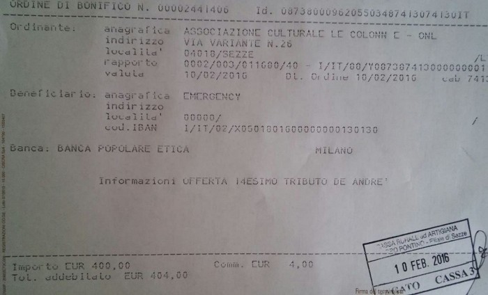 la ricevuta del versamento di 400 € - parte dell'incasso devoluto in