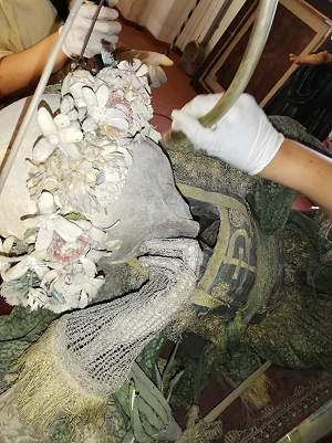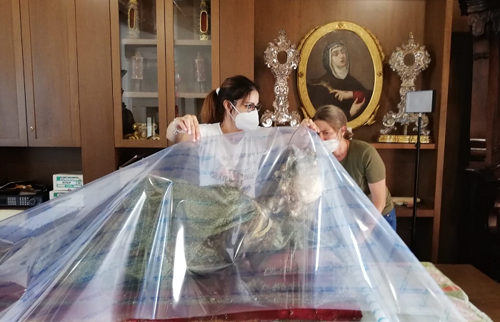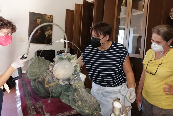 Solo nel 2021, grazie ai fondi messi a disposizione della soprintendenza (direttore a quei tempi il dott. Francesco Di Mario) all’interno di un più ampio progetto curato dalla dott. Monica Sabatini, dopo aver coinvolti i locali Archivio capitolare della cattedrale e Museo diocesano d’arte sacra per le necessarie ricerche storico-archivistiche, sono iniziate le operazioni previe di pulizia, disinfestazione e quindi di diagnostica del corpo-santo (queste ultime condotte dal dott. Stefano Ridolfi), in maniera da poter poi procedere con un ulteriore intervento, questa volta mirante al restauro conservativo e alla reintegrazione dei tessuti settecenteschi, lavoro affidato alla dott. Barbara Santoro, qualificata restauratrice del settore. Il tutto è stato condotto sotto la supervisione del responsabile del procedimento dott. Lorenzo