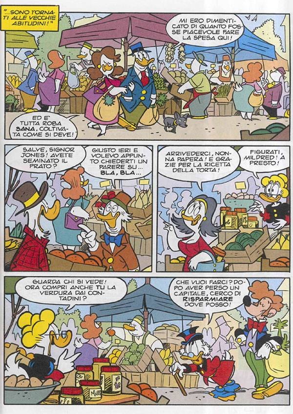 markets, i famosi mercati del contadino che offrono prodotti a km 0, conquistano anche la copertina di Topolino, dove clienti d’eccezione comprano a Paperopoli “ tanta roba sana, coltivata come si deve” e dove l’attento Paperon de Paperoni dice “cerco di risparmiare come posso”. Il calo di vendite dei suoi supermercati spinge infatti Paperone a fare un giro al mercato degli agricoltori dove fanno la spesa anche i suoi nipoti. “I prodotti sono a km zero coltivati nelle terre intorno a Paperopoli” gli spiegano Qui, Quo e Qua “cosi si evitano lunghi viaggi inquinanti per il trasporto, e frutta e verdura sono più buone perché appena raccolte”.