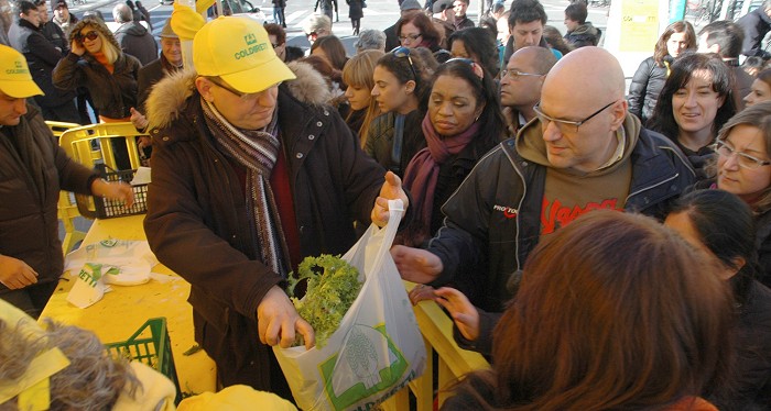 16 febbraio 2012 Oltre a ciò troviamo intollerabile che in tempi di crisi, mentre si stanno spremendo gli italiani per trovare risorse al debito sovrano, lo Stato italiano butti ben 11 milioni di euro per finanziare le aziende italiane che realizzano gli stabilimenti all’estero, che occupano manodopera straniera, che comprano la materia prima straniera e che vendono con i marchi dei nostri territori, facendo concorrenza al vero made in Italy prodotto nelle nostre aziende. E’ inaccettabile, è immorale è scandaloso! Lo Stato italiano, infatti ha promosso la vendita all’estero della bresaola uruguaiana ma anche la finocchiona, il salame toscano e il culatello prodotti negli Stati Uniti e venduti a New York da una salumeria di un noto gruppo industriale italiano, Parmacotto, il quale ha stipulato un vantaggioso accordo che prevede l’investimento di ben 11 milioni di euro nel proprio capitale sociale da parte di una società per azioni, la SIMEST, controllata dal Ministero dello Sviluppo Economico con la partecipazione dei privati. Non è un caso isolato perché già qualche anno fa la SIMEST fu coinvolta con il latte in quanto commercializzava, attraverso LACTITALIA sia in Italia che in altri Paesi europei, formaggi di tradizione italiana fatti con latte romeno commercializzati con nomi e loghi evocativi della nostra tradizione ma che con il tricolore avrebbero ben poco a che fare. Produrre pecorino in Romania con latte e lavoro rumeno e soldi dei cittadini italiani, per poi venderlo in Europa e nel mondo, con l’aggravante dell’italian sounding, in concorrenza con quello vero nazionale, non è infatti semplice delocalizzazione ma la forma piu’ becera della delocalizzazione e l’attacco piu’ violento al vero Made in Italy a spese dei contribuenti italiani. Nella foto un momento della distribuzione gratuita a Roma di frutta e ortaggi durante lo sciopero dei Tir nella manifestazione Coldiretti "Coraggio Italia!" In primo piano a distribuirei gli ortaggi di Sezze il segretario della Sezione Paolo Marchetti.