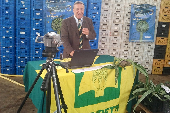 17 aprile 2012 Le telecamere di Raitre oggi hanno fatto il loro ingresso in diretta televisiva nell’Azienda Agricola Del Duca con la trasmissione Buongiorno Regione. E’ stata una occasione fortemente voluta da Coldiretti Sezze, con l’intento di promuovere e valorizzare il nostro carciofo che domenica 22 Aprile verrà esposto nel centro storico del paese alla 43a Sagra. Alla trasmissione hanno partecipato il Presidente della Sezione di Sezze Vittorio Del Duca, il Presidente Provinciale Carlo Crocetti e il Direttore Savero Viola, nonché il dirigente del settore Cultura del Comune di Sezze, Piero Formicuccia, oltre a numerosi produttori di Coldiretti accorsi per l’occasione. Le