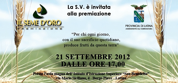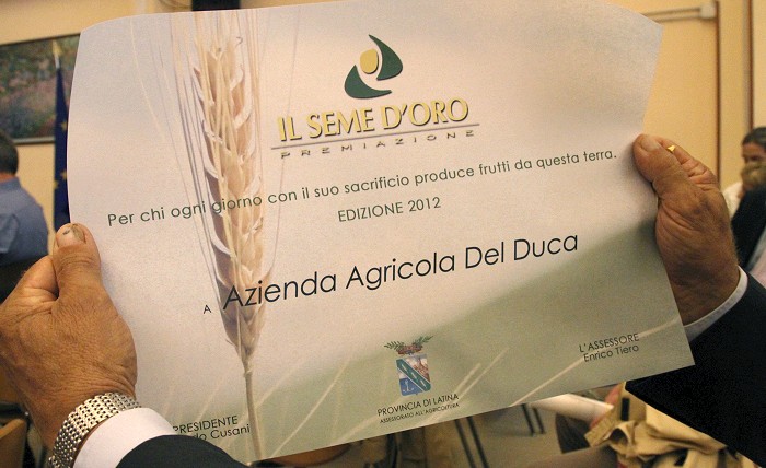 Sezze, 18 settembre 2012 Premio "il Seme d'oro" all'azienda Del Duca L'assessorato provinciale all'agricoltura ha riconosciuto all'azienda storica e rappresentativa dell'agro Pontino "Del Duca" il premio "il Seme d'oro". La premiazione, presieduta dal dott. Enrico Tiero - assessore all'agricoltura della Provincia di Latina, avverrà Venerdì prossimo 21 settembre alle 17 presso l'Istituto Agrario di Borgo Piave.