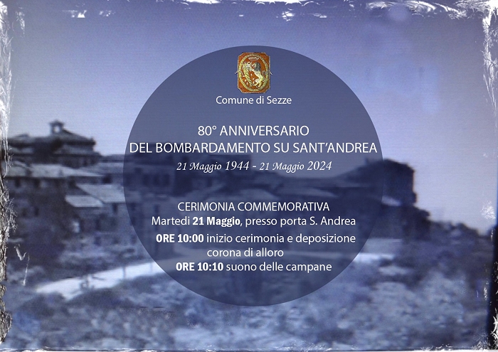 Sopra un fermo immagine estratto dal filmato dell'Istituto Luce girato il 26 maggio 1944. Si notano le rovine della chiesa di Sant'Andrea che cinque giorni prima (domenica 21) alle 10,30 del mattino era gremita di fedeli ( tutte donne, anziani e bambini ) che assistevano alla funzione religiosa. All'improvviso un rombo assordante ha rotto il silenzio e la pace nel paese, e gli aeri amiricani sono piombati sull'abitato della cità di Sezze sganciando il primo carico di bombe e ripassando una seconda volta facendo strage di civili. La foto sotto è stata eseguita il 21 maggio 1975 a trent'anni dal bombardamento americano di Porta Sant'Andrea. In quella occasione tutto il paese si bloccò ed una folla di persone accorse all'inaugurazione delle due lapidi commemorative dove ogni anno, il 21 di maggio, viene deposta una corona di fiori in memoria dei 71 morti dei bombardamenti americani.