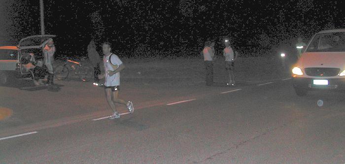 occhi: rivedo la scena vissuta da me ore indietro. 8. Alle 4:04 arriva, dopo aver percorso circa 78km in solitaria, Simona. Riuscita a percorrere i 100km del percorso, correndo di continuo, in 13 ore e 4 minuti si piazza al 22-esimo posto tra le donne ed al 243° posto assoluto. Nonostante la quantità di ore di corsa arriva fresca e lucida. Un grosso sorriso testimonia la soddisfazione e, nello stesso tempo, l’incredulità di essere arrivata. Dopo essersi fatta la doccia torna al traguardo e, insieme a me, aspetta l’arrivo dei nostri tre amici. 9. Alle 5:50 vediamo Agostino. Ci annuncia l’imminenete arrivo dei nostri compagni di squadra. Alle 5:53 dopo ben 15 ore e 53 minuti di corsa tagliano il traguardo provati, chi più e chi meno, da dolori e freddo, Francesco, Antonello e Maurizio. Antonello, definirlo eroe è poco, ha corso gli ultimi 30km con un enorme piaga sotto il piede. Maurizio, con gravi problemi ad un menisco, ha visto premiata la sua invidiabile forza di volontà, Franco particolarmente provato dal caldo iniziale ha resistito alla tentazione di un facile ritiro, portando a termine una vera e propria impresa.