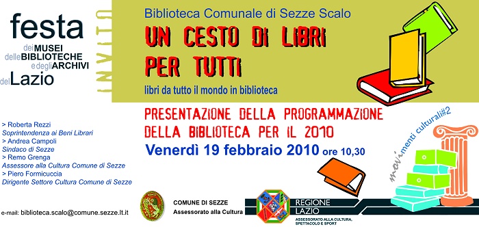 16 febbraio 2010, comunicato stampa II Edizione della Festa dei Musei, delle Biblioteche e degli Archivi Storici del Lazio: presentazione del progetto "Un cesto di libri per tutti" della Biblioteca Comunale di Sezze Scalo. Venerdì