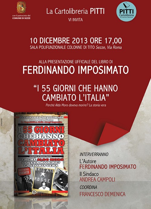 10 novembre 2013 Il 10 dicembre alle ore 17,00 nella sala polifunzionale Colonne di Tito a Sezze verrà presentato il libro di Ferdinando Imposimato "I 55 giorni che hanno cambiato l'Italia".