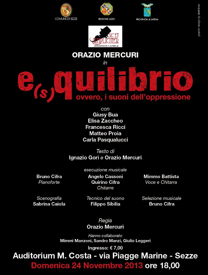 23 novembre 2013 Domenica 24 novembre alle ore 18,00 va in scena all'auditorium Mario Costa di Sezze "e(s)quilibrio" l'ultima fatica di Orazio Mercuri scritta a quattro mani con Ignazio Gori.