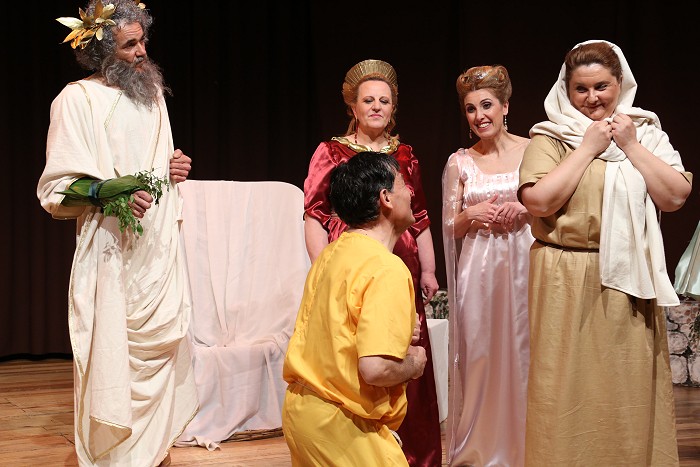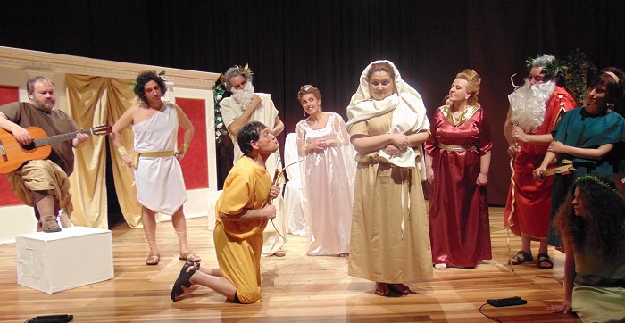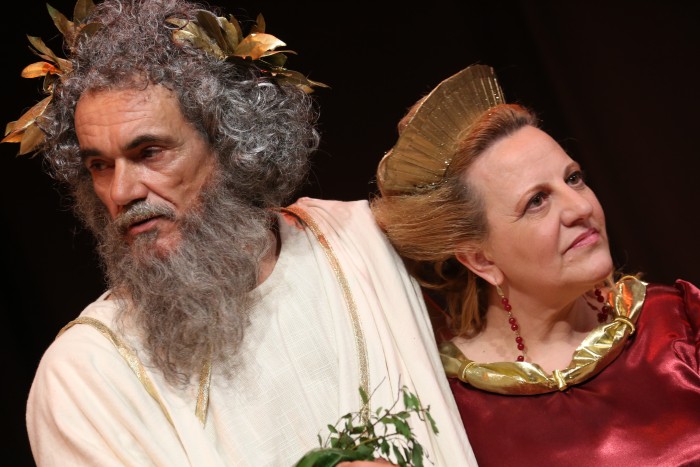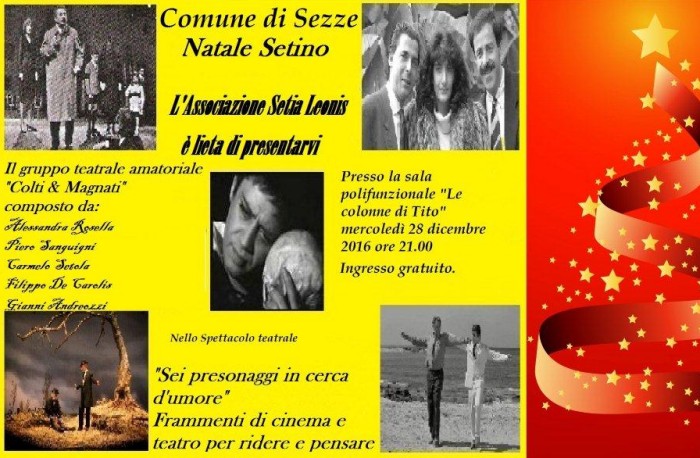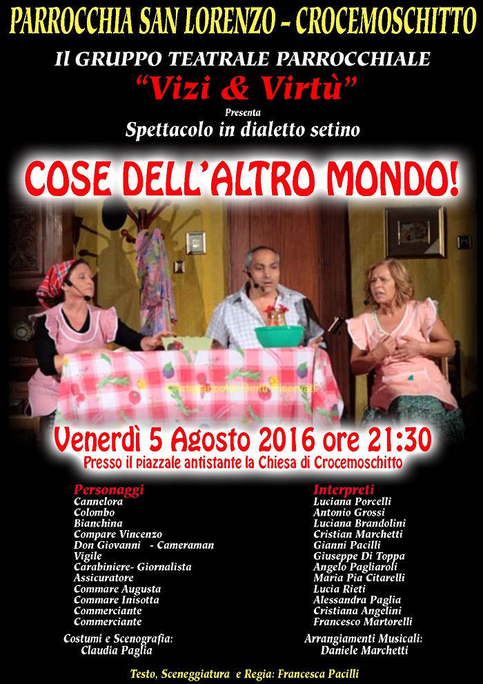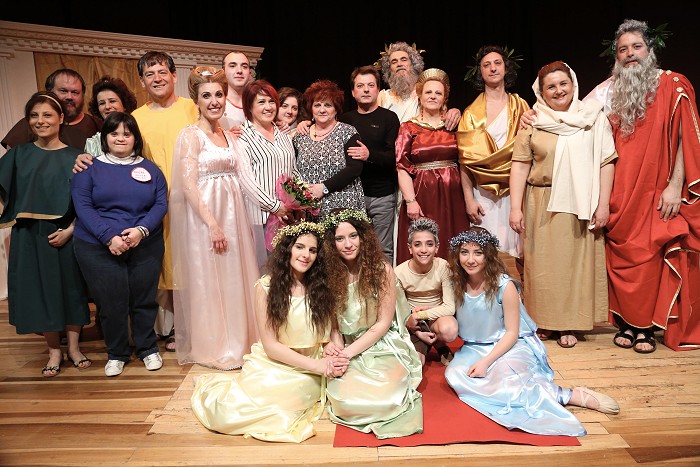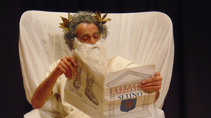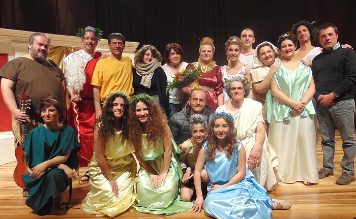l'assistenza di Claudio Macera parrucchiere, Carla Arduini truccatrice e Maria Teresa Rieti costumista, suoni e luci Fabrizio Malagiggi e al prezioso contributo di Elena Fanella e Alberto Giordani del Gruppo Folk " I Turapitto". In un tempo non determinato, si intrecciano intrigate e problematiche vicende molto umane.Giove il capo famiglia (Luigi Tasciotti), con la moglie Giunone (Annamaria Bovieri) accompagnata dalle giovani Grazie ( Sara Siragusa, Susanna Castaldi, Sara Capuccilli), vi intratterranno in compagnia di un Cupido (Vittorio Faustinella) capriccioso, di una preoccupata Venere (Giusy Bua), un perfido Apollo (Andrea Santucci), il vecchio Saturno ( Alberto Giordani) e non poteva mancare Ercole (Tiziano Santucci), fondatore di Sezze, con sua madre Alcmena ( Elena Fanella). Insomma una commedia che vede elementi classici mescolati alle tradizioni locali nei personaggi di Cintruda (Francesca Orsini) e Pappino (Luigi Costantini). Il finale è tutto da scoprire, vi aspettiamo all’Auditorium M.Costa di Sezze il 24 gennaio alle ore 21, non mancate.