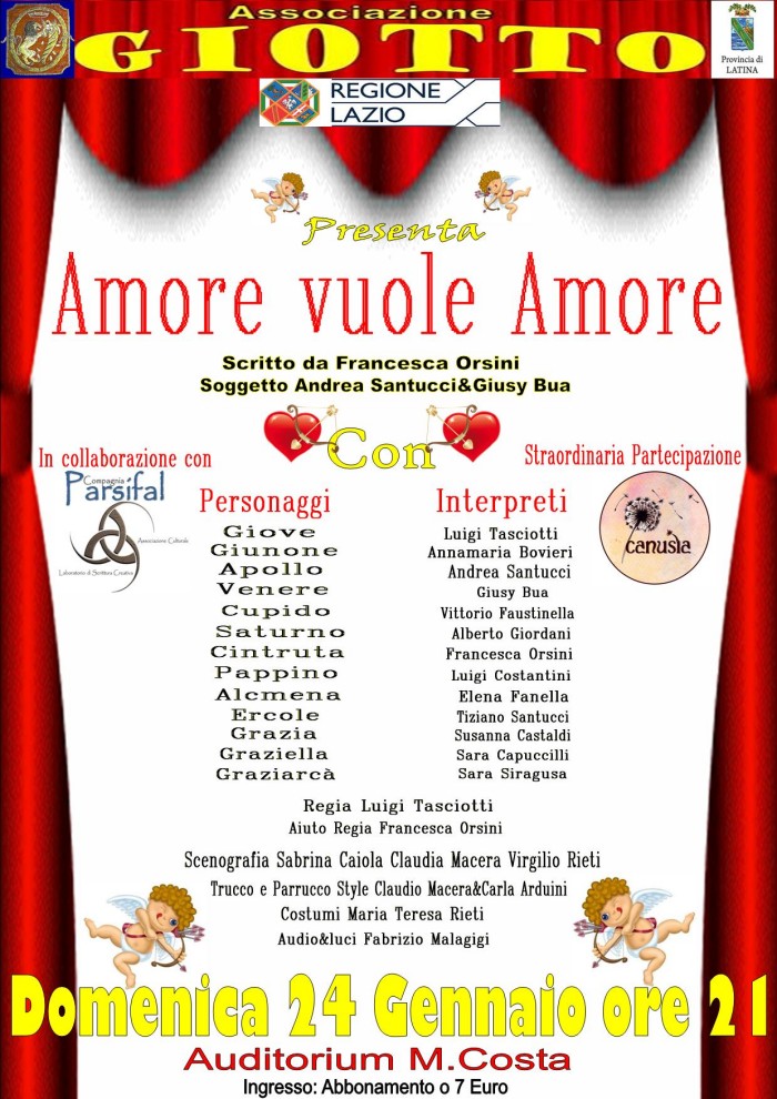 Nei laboratori della Compagnia Parsifal da un soggetto di Andrea Santucci e Giusy Bua è nata la commedia "Amore vuole Amore" scritta da Francesca Orsini. Lo spettacolo sarà messo in scena dall' Associazione Giotto, domenica 24 gennaio alle ore 21,00 all'Auditorium Mario Costa in occasione della Rassegna Teatrale 2015/16 organizzata dal Comune di Sezze con il patrocinio della Regione Lazio e della Provincia di Latina.