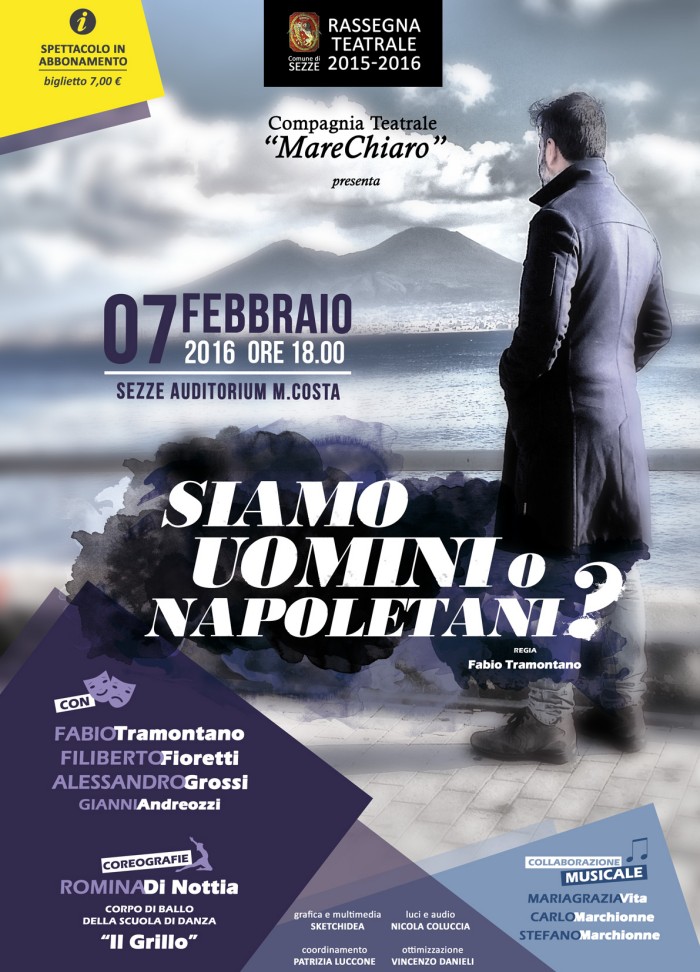 comunicato stampa La compagnia MareChiaro presenta: "Siamo uomini o napoletani" Sinossi Un uomo continua il suo viaggio alla ricerca delle proprie radici tra umorismo e riso. Un riso che si fa amaro e dolce, in bilico tra la voglia del futuro, la nostalgia del passato e l’umorismo del presente. Nel viaggio incontra le maschere, le origini e i maestri. Il tutto dentro la sua città: Napoli. Tutto si svolgerà alla ricerca di un equilibrio interno ed esterno. Continuamente uno sguardo, il suo sguardo, si sofferma sui tic e sugli umori di un popolo, pronto al riso e al pianto. Non tutti riescono a risolvere i problemi di una giornata con una battuta. Lui ci prova. Non tutti riescono ad entrare in profondità, lui ci riesce. Prova a conoscere, prova a guardare con stupore, tutto quello che lo rappresenta. Prova a vivere d’amore, di passione, di verità seguendo la forza della tradizione e il mistero di una vita che è “terra mia”. Un sogno che si fa realtà: il palcoscenico. Note di regia Un racconto è sempre diviso in più parti. La seconda parte di un racconto prova a dire qualcosa di diverso, prova a smentire, prova a ribaltare i piani. Propone con irriverenza il lato B della vita tra un monologo e una gag, puntellando la narrazione con canzoni, balletti e sketch. Non solo teatro ma tanta buona musica dal vivo, diverse coreografie e videoclip. Le arti si alternano nella costruzione di un racconto avvincente, sempre crescente. Le immagini colorano ogni battuta, sullo sfondo i maestri di una vita. Dietro ogni parola, la visione di un popolo e la visione personale raccontano un viaggio pieno di insidie, pieno di sé.