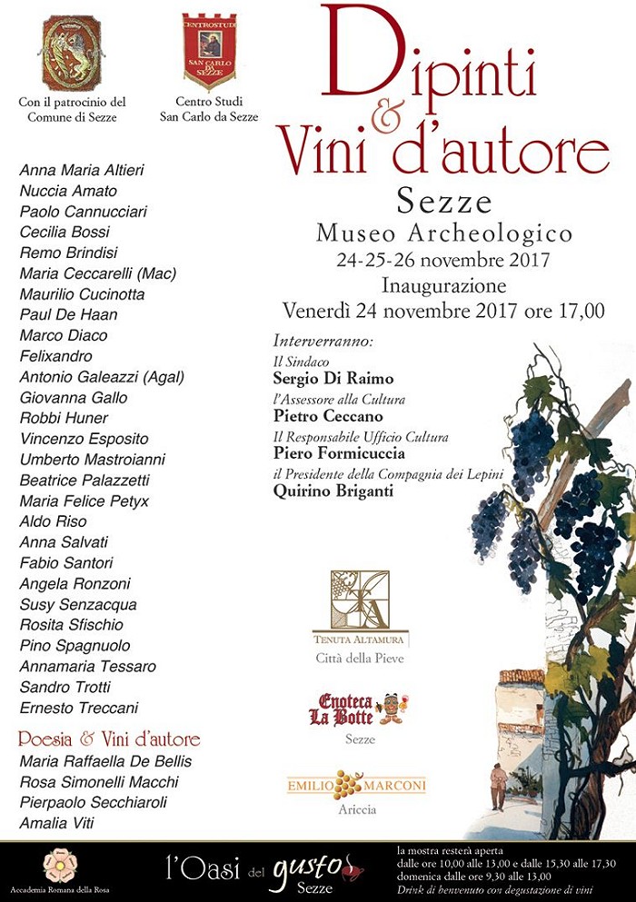 Dipinti e Vini d'autore 24, 25, 26 novembre presso le sale del Museo Archeologico di Sezze Benvenuti a Sezze. Il sindaco Sergio Di Raimo e l’assessore alla cultura Pietro Ceccano, inaugurano venerdì 24 novembre alle ore 17.00 la quarta edizione di “Dipinti e Vini d’Autore” ospitata fino al 26 novembre nelle splendide sale del Museo Archeologico (interverranno il responsabile dell’Ufficio Cultulra Piero Formicuccia e il Presidente della Compagnia dei Lepini Quirino Briganti). La rassegna, sponsorizzata dall’Oasi del gusto di Sezze e organizzata in collaborazione con l’Accademia Romana della Rosa, coinvolge le opere di una ventina di artisti contemporanei e tre aziende vinicole: la Tenuta Altamura di Città della Pieve, l’Enoteca La Botte di Sezze e l’Azienda Emilio Marconi di Ariccia. Ogni produttore ha realizzato un numero limitato di bottiglie di vino che hanno come etichette la riproduzione delle opere in mostra degli artisti coinvolti. Uno scambio di voci, un insieme di narrazioni poetiche e di profumi dove arte e vino sono uniti alla ricerca di un nuovo percorso ricco di emozioni … e di gusto. Sottile e ironica Nuccia Amato, descrittivo e plastico Marco Diaco, poetico ed evocativo Antonio Galeazzi. Poi la vibrante luminosità di cromie contrastate di Anna Maria Tessaro, l’eleganza compositiva di Paul De Haan, la forza e la poesia del segno di Fabio Santori. Anna Salvati sfuma la realtà verso l’astrazione, Pino Spagnuolo si esprime con segni pittorici di forte intensità cromatica e Anna Maria Altieri si spinge fino ad una tormentata rivisitazione della realtà. Fiabesca Giovanna Gallo, cosmico e metafisico Felixandro, surreale e onirico Paolo Cannuciari, lirica, fantasiosa e incisiva Maria Ceccarelli. E ancora un angolo di paese in un luminoso acquarello di Vincenzo Esposito e un olio di forte impatto visivo di Maurilio Cucinotta, esponente del nuovo realismo. Di spiccata ispirazione classica Rosita Sfischio, di serenità arcaica Angela Ronzoni. Si continua con i lavori su carta di Remo Brindisi, Ernesto Treccani, Umberto Matroianni, Aldo Riso e Cecilia Bossi in dialogo con un’opera fotografica di Robbi Huner testimone di una cruda “realtà senza confine”. Completano il panorama espositivo altre tre voci dell’arte nostra ultima: di Susy Senzacqua rossi intensi scritti in un cielo azzurro; di Beatrice Palazzetti l’eleganza del segno amalgamato in una luce lieve; di Maria Felice Petyx la pulsione celebrativa e vitale della materia. Arricchisce la rassegna la sezione “Poesia e Vini d’Autore” con la partecipazione dei poeti Maria Raffaella De Bellis, Rosa Simonelli Macchi, Pierpaolo Secchiaroli e Amalia Viti.
