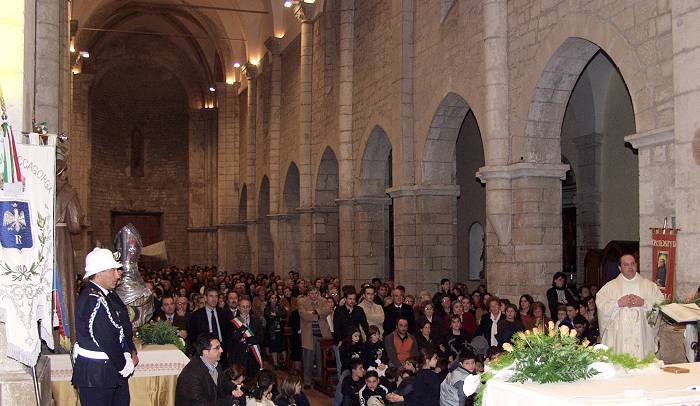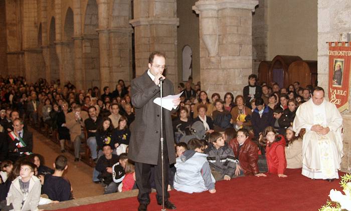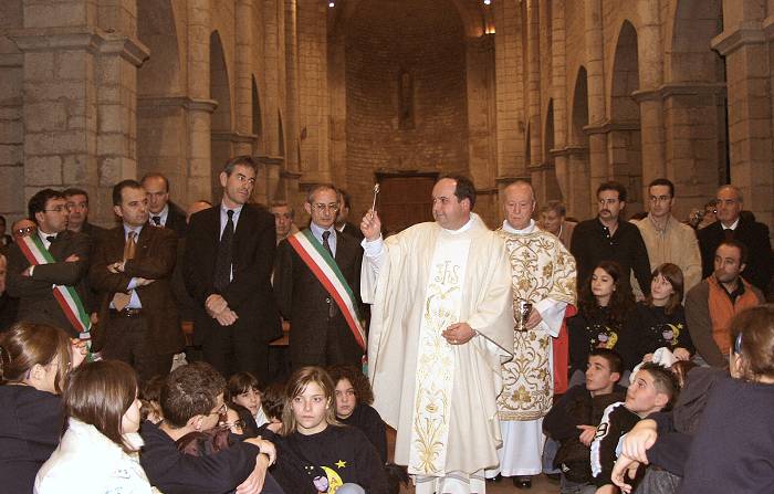 La cerimonia liturgica di insediamento di don Luigi Libertini si è svolta, “in pompa magna” e con rituale molto ricco di segni visibili e di alto valore teologico, presieduta dal vescovo mons. Petrocchi, alla presenza di tutto il clero paesano e di rappresentanti diocesani. Il rito liturgico di inizio del ministero del nuovo “parroco” ha fortemente sottolineato i significati “ecclesiali” di alcuni atti o di alcune formule recitate dal vescovo. Tutto è stato compiuto con l’intento di “spiegare”, al folto numero dei fedeli partecipanti, l’enorme significato della presa di possesso di una chiesa parrocchiale, il valore della obbedienza al proprio vescovo, l’immissione sul “seggio” di presidenza del neo-parroco, l’imposizione delle mani sopra di lui ecc. ecc. Le stesse letture proclamate sull’ambone richiamavano brani biblici di contenuto “pastorale”: la 1^ lettura ( Isaia 66, 10-14) , la 2^ lettura ( Galati 6, 14-18), il Salmo n° 65, il Vangelo ( Luca 10, 1-9)… Si è data lettura del Decreto Vescovile della nomina e dell’immissione in possesso ( Atto del 14.11.2003 redatto e firmato in Cancelleria, con apposito giuramento del neo parroco don Luigi Libertini). articolo di Carlo Luigi Abbenda La cerimonia ufficiale per don Luigi