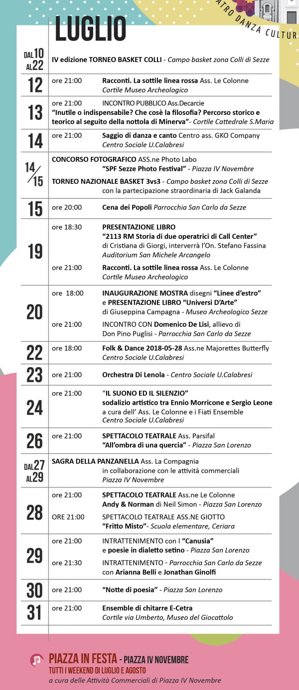 22 luglio 12° Folk & Dance - Centro Sociale Ubaldo Calabresi24 luglio Concerto dei Fiati Ensemble - Centro Sociale Ubaldo Calabresi 3 - 12 agosto 33° edizione Torneo Internazionale di Tennis 27 ottobre Premio Letterario Antonio Campoli L'