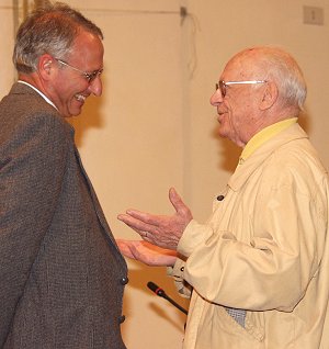 E' breve l'intervento di monsieur Maurice Clos che non intende essere al centro dell'assemblea, ma dopo i saluti e gli auguri di rito, prima di cedere la parola, si compiace di aver incontrato nel viaggio dalla Francia fino a Sezze molte bandiere della Pace. Segno di una volontà popolare chiara, che va oltre gli interessi e le ragioni degli stessi governanti del mondo.