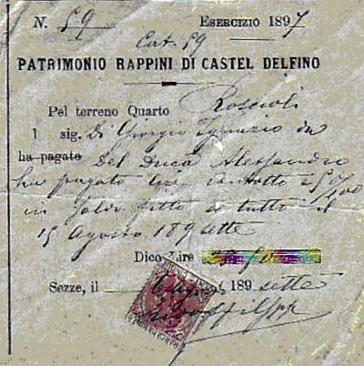 Ricevuta di affitto del fondo in località Quarto Roscioli di Sezze del 15 Agosto 1897