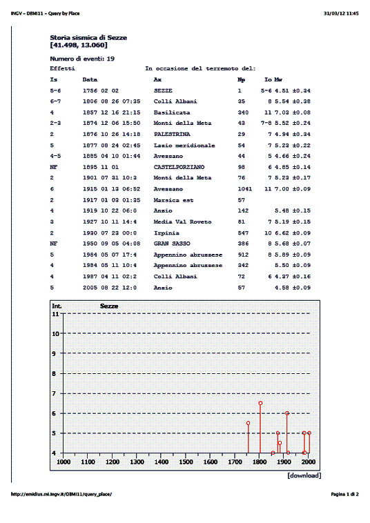 Sezze, ho trovato nel Portale d’Abruzzo, nella sezione dei terremoti storici dal 217 a.C. al 2002, che uno solo ha riguardato direttamente la nostra città e precisamente quello del 2 Febbraio 1756, giorno della Candelora, con epicentro nelle colline di Sezze di magnitudo 4,63, superiore di quasi un grado a quello avvertito nella città il 15 febbraio 2012 alle ore 21, 46 con epicentro Tor Tre Ponti Per quanti desiderassero notizie più approfondite sulla sismicità della nostra area rimandiamo ai siti che ci sono stati suggeriti dalla mail della Dott.ssa
