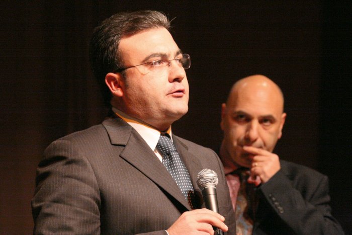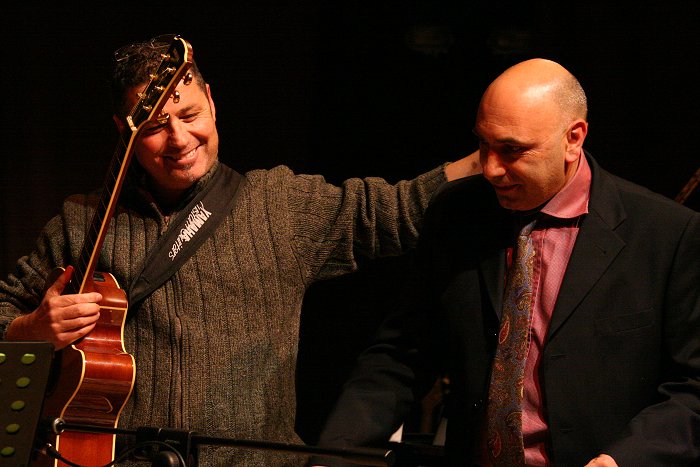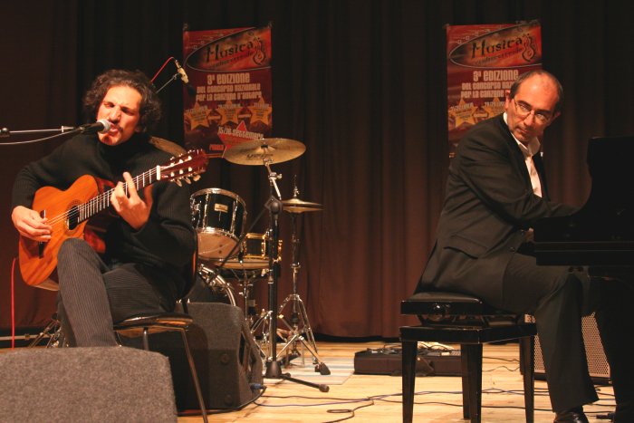 Sergio Garroni, Presidente del festival Misicacontrocorrente, con Faustinella che ha presentato la serata