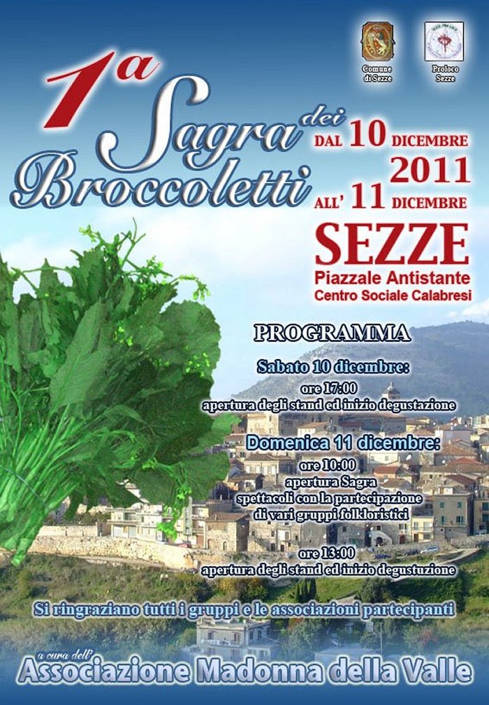 Per la prima volta quest'anno le feste natalizie a Sezze iniziano con la Sagra dei Broccoletti. Prodotto tipico dei Monti Lepini, i broccoletti di Sezze sono tra le verdure più ricercate per i piatti più prelibati della nostra cucina. Così dopo la sagra del carciofo ad aprile, quella della zuppa di pane e fagioli e quella della panzanella ad agosto, ecco arrivare a dicembre la Prima Sagra dei Broccoletti. In tanti nel paese ne sentivano l'esigenza, qualcuno stava per prepararla, ma ad anticipare tutti è stata l'Associazione Madonna della Valle guidata da Armando Uscimenti. Il sodalizio dei volontari del quartiere dei Casali ha messo in piedi un progetto che coinvolge tanti soggetti, con il patrocinio del Comune di Sezze e quello della Pro Loco, ma soprattutto con l'intenzione di dar vita ad un nuovo appuntamento partendo con il piede giusto verso una lunga storia di cooperazione. Tra i contenuti della prima sagra dei broccoletti setini c'è l'esibizione di alcuni gruppi folkloristici, tra cui quello del gruppo "I Turapitto" guidati dal presidente Daniela De Angelis, l’associazione Mantice di Latina con la sua ricerca di musiche popolari, l'esposizione dei prodotti tipici della nostra campagna ed ovviamente la degustazione di piatti a base di broccoletti.
