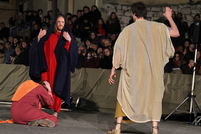 3 Allora gli scribi e i farisei gli condussero una donna còlta in adulterio; e, fattala stare in mezzo, 4 gli dissero: «Maestro, questa donna è stata còlta in flagrante adulterio. 5 Or Mosè, nella legge, ci ha comandato di lapidare tali donne; tu che ne dici?» 6 Dicevano questo per metterlo alla prova, per poterlo accusare. Ma Gesù, chinatosi, si mise a scrivere con il dito in terra. 7 E, siccome continuavano a interrogarlo, egli, alzato il capo, disse loro: «Chi di voi è senza peccato, scagli per primo la pietra contro di lei». 8 E, chinatosi di nuovo, scriveva in terra. 9 Essi, udito ciò, e accusati dalla loro coscienza, uscirono a uno a uno, cominciando dai più vecchi fino agli ultimi; e Gesù fu lasciato solo con la donna che stava là in mezzo. 10 Gesù, alzatosi e non vedendo altri che la donna, le disse: «Donna, dove sono quei tuoi accusatori? Nessuno ti ha condannata?» 11 Ella rispose: «Nessuno, Signore». E Gesù le disse: «Neppure io ti condanno; va' e non peccare più».]