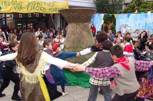 Nel cortile della scuola un grande girotondo attorno alle tradizioni di Sezze, nel centro un enorme "concono" recipiente simbolo dei paesi a sud di Roma, tutto a torno oggetti e raffigurazioni della quotidianità del tempo che fu.