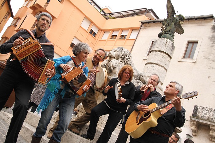 i componenti del gruppo Tiziana Spini – voce, castagnette – Presidente dell’Associazione Folk Club Latina. Ha sempre mostrato una accesa passione per il canto popolare di cui è un’interprete naturale. Dal 2000 insegna canto popolare presso il Centro Diurno Priverno. Ha tenuto laboratori di canto e ballo popolare in diverse scuole della provincia. Orlando D’Achille – oboe, flauti, ciaramella – Diplomato al Conservatorio e docente di oboe presso il Conservatorio di Frosinone si avvicina alla musica popolare nel 2002. Da allora si dedica anche allo studio e alla valorizzazione di strumenti a fiato popolari come la ciaramella, la bombarda, il flauto di latta, la tituella. Collabora con il Maestro Giovanni Tadino nella ricostruzione di flauti traversi storici. Cura gli arrangiamenti dei brani con l’obiettivo di attualizzarli ma senza alterarne le caratteristiche principali. Paolo Incollingo - chitarra, voce - Inizia a suonare e cantare già in tenerissima età, prima accompagnandosi con una pianola giocattolo, poi a 11 anni, con la chitarra dalla quale non si separerà più. Al suo attivo una significativa esperienza di canto con la “Corale San Marco” e l’ensamble vocale “Circolo delle Quinte Vuote” dove fa proprio il repertorio rinascimentale italiano. Le tecniche apprese nello studio del canto lirico, presso la Maestra Donata Tabet, gli fanno affinare le innate doti espressive e melodiche, che mette ormai a frutto anche in altri contesti musicali. Si avvicina con entusiasmo alla musica popolare nel 1999 entrando a far parte del gruppo. Laura Perazzotti – organetto, voce – Diplomata al Conservatorio in pianoforte è Presidente dell’Associazione Domus Mea di Latina. Da sempre sostenitrice e appassionata della musica e delle tradizioni popolari inizia a suonare l’organetto nel 2003 seguendo i corsi di Massimiliano Felici. Insegnante di educazione musicale presso la scuola media Corradini di Latina. Tiene corsi di musica e gioco per bambini e laboratori di musica popolare nelle scuole medie della provincia di Latina. Gianni Netto - tamburi a cornice, percussioni, grancassa - Laureato in Scienze Agrarie lavora al Parco Nazionale D’Abruzzo come Responsabile del Settore Educazione Ambientale. Profondo conoscitore della natura e delle tradizioni popolari, inizia a suonare il tamburello nel 2001 seguendo i corsi di Raffaele Inserra, Angelo Giuliani e Davide Conte. Ha tenuto diversi seminari tra i quali quello sui “Ritmi della natura e ritmi del tamburo”.