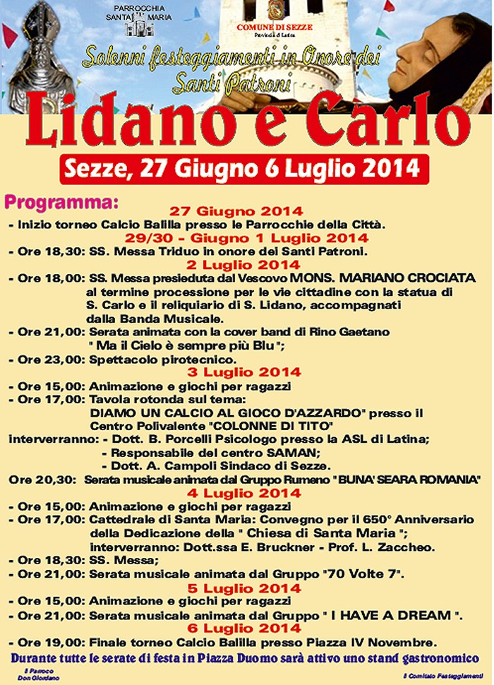 Programma dei festeggiamenti 2014 Sezze, 27 giugno - 6 luglio 2014 Piazza del Duomo Mercoledì 2 luglio ore 18,00 Santa Messa a seguire solenne processione ore 21,00 spettacolo musicale Ma il cielo è sempre più blu Giovedì 3 luglio ore 17,00 tavola rotonda Diamo un calcio al gioco d'azzardo (Colonne di Tito) ore 21,00 spettacolo musicale Gruppo Buna Seara Romania Venerdì 4 luglio ore 21,00 spettacolo musicale Gruppo 70 volte 7 ore 17,00 convegno 650° dedicazione Chiesa Santa Maria Sabato 5 luglio ore 21,00 spettacolo musicale I have a Dream Domenica 6 luglio ore 19,00 torneo calcio balilla (Piazza IV Novembre)