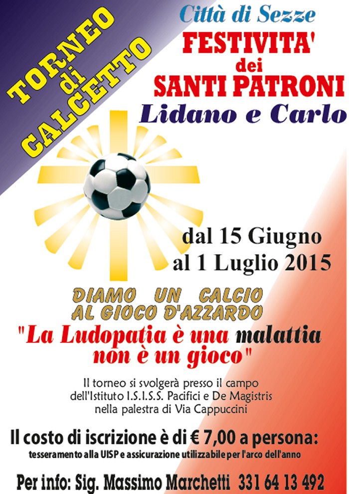 Diamo un calcio al gioco d’azzardo: un’iniziativa per la festa dei patroni In occasione della manifestazione "Nessuno Escluso" le associazioni parrocchiali di Santa Maria di Sezze organizzano il convegno: "La ludopatia è una malattia, non un gioco". Incontro con il Dott. Bruno Porcelli delle ASL di Latina. Sabato 27 giugno 2015 ore 16 presso Centro Caritas Sant'Andrea di Sezze.
