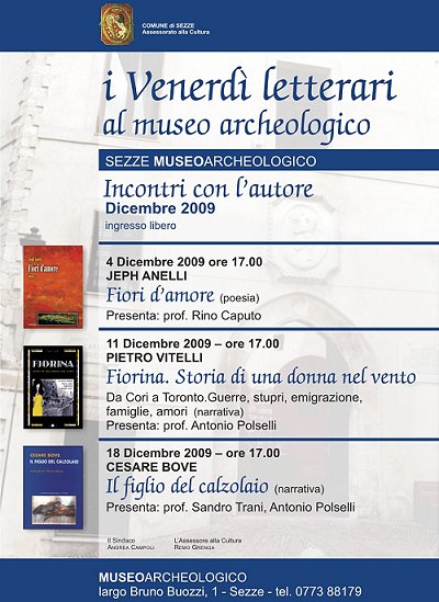 "I Venerdì letterari al Museo Archeologico" Saranno tre gli incontri con autori setini, previsti nel calendario de "i Venerdì letterari al Museo Archeologico". L'evento, promosso dall'Assessorato alla Cultura del Comune di Sezze, è finalizzato alla promozione della lettura e della cultura letteraria. "L'iniziativa - ha dichiarato l'Assessore Remo Grenga - è finalizzata a valorizzare la produzione libraria più recente e appena edita degli autori locali e del territorio provinciale e regionale, di genere letterario diverso, in modo da soddisfare le preferenze di un pubblico più vasto. Cercheremo, in seguito, di coinvolgere anche scrittori affermati in campo nazionale". Si prevede, nello specifico, l'incontro con gli autori e le letture delle opere da parte di attori e attrici setini, cui potrà far seguito un dibattito sui temi affrontati. Il