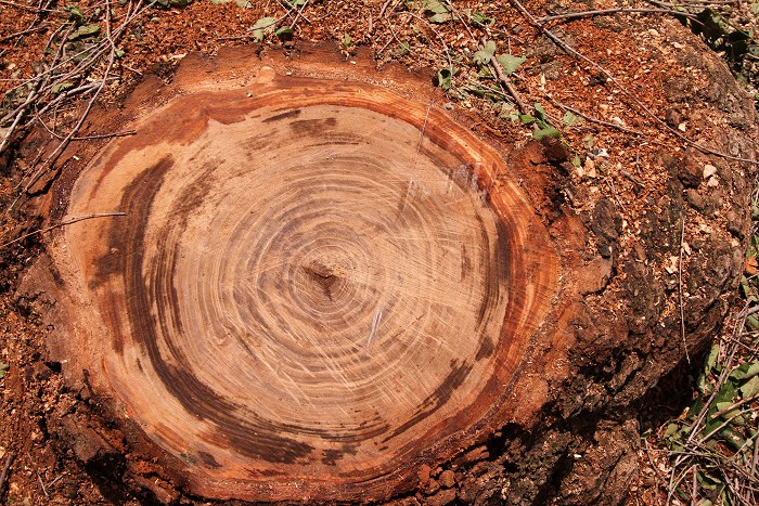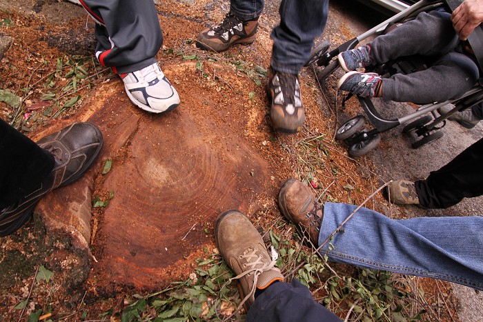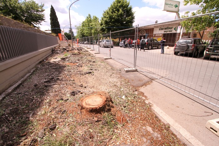 La base degli olmi tagliati dalle motoseghe del Comune in via dei Cappuccini