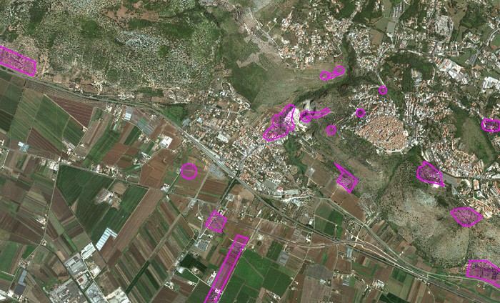 di Sezze. Le macchie di colore rappresentano le costruzioni già