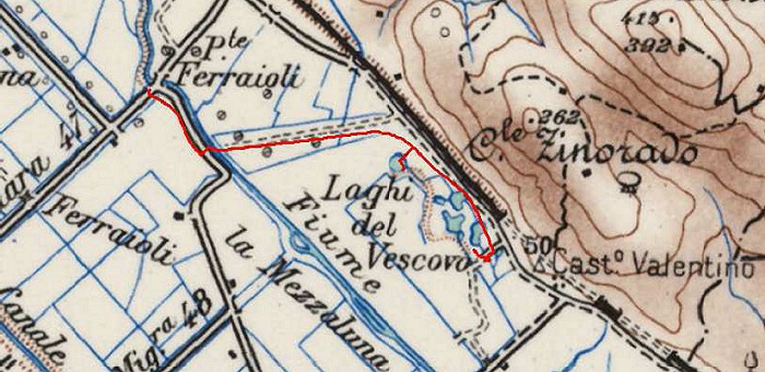 Laghi del Vescovo Dislivello: Praticamente assente Difficoltà: T/E Tipologia terreno: sterrato carrozzabile (fangoso) Attrezzatura: Scarpe antiscivolo (impermeabili) abbigliamento anti-pioggia, acqua al seguito. Descrizione Il percorso inizia partendo da Ponte Ferraioli nei pressi del ristorante Da Angeluccio. Si prosegue per circa 600metri in direzione S/E sulla Strada Mezzaluna. Si svolta a sinistra attraversando un ponte su una sterrata che costeggia il Fiume Ufente (Fosso Ceriara) al Km2 dalla partenza si devia verso destra S/W fino a raggiungere il Lago di San Carlo. Dopo averlo visitato si torna indietro per raggiungere di nuovo il lungo argine. Si svolta a destra S/E si costeggiano le rive del Lago Verde e del Lago Bianco fino a raggiungere l'ingresso dell'Oasi San Valentino. Si entra nell'oasi dove si procederà con la visita del Lago Nero e della Fontana del Gelso (fonte termale). Per il ritorno si percorrerà a ritroso lo stesso percorso. Per