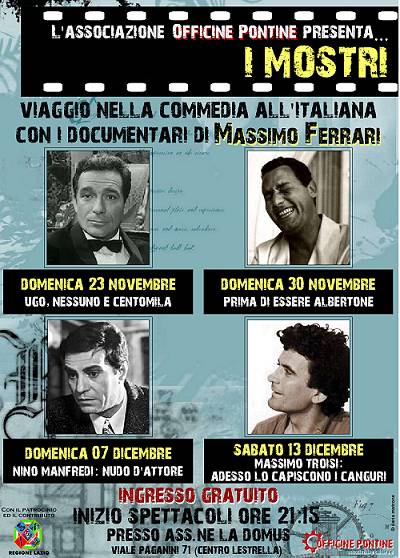 28 novembre 2008 "Prima di essere Albertone" - Associazione culturale “Officine Pontine” Appuntamento per domenica 30 novembre alle 21.15 presso l’associazione La Domus Nuovo appuntamento della rassegna “I Mostri. Viaggio nella commedia all’italiana con i documentari di Massimo Ferrari” organizzata dall’associazione culturale “Officine Pontine”. Dopo il documentario “Ugo nessuno e centomila” dedicato ad Ugo Tognazzi e proiettato domenica scorsa, ora è la volta di “Prima di essere Albertone” dedicato all’indimenticabile Alberto Sordi. Tutti conoscono i mille personaggi di Alberto Sordi, le numerose sfaccettature dell’italiano medio cui ha dato vita. Ma qual è stato il percorso che lo ha portato a diventare l’Albertone nazionale? Il giovane regista pontino Massimo Ferrari, dal 2003 autore e regista per “Cinecittà Entertainment”, nel documentario “Prima di essere Albertone” vuole far conoscere allo spettatore la prima parte della carriera di Alberto Sordi, quella che va dalle sue prime comparsate a Cinecittà durante la guerra, fino al 1954, quando ci fu la consacrazione con “Un americano a Roma”. Il tutto passando attraverso gli esordi radiofonici, il doppiaggio, i primissimi film e la scommessa di Fellini, che lo rende protagonista in “Lo sceicco bianco” e “I vitelloni”. “Quando ero un ragazzino – ha raccontato Sordi - come tutta Roma affamata, venivo a Cinecittà a fare la comparsa. Ci facevano entrare dall’ingresso secondario degli stabilimenti. Il capo comparse ci divideva per ruoli: Gallo…romano…gallo…romano…gallo…romano”. Prima ancora del volto, è la voce di Alberto Sordi a diventare celebre alla radio e al cinema: nel documentario sono presenti rari materiali di Archivio della Radio Rai delle trasmissioni radiofoniche più importanti dell’attore come quella del Conte Claro o quella di Mario Pio oltre alla inconfondibile voce del primo one man show radiofonico “Vi parla Alberto Sordi”.