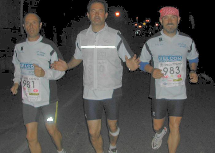 Fratarcangeli, F. Monaco, S. Vicaro, A. Vicenti, M. Marsella 1. Alle 15:00 la pistola dello starter dà il via alla sfida. Fin da subito si intuisce che il sole renderà le cose più difficili. Percorso il primo km dentro Firenze imbocchiamo la statale 302, quella che avevamo percorso la mattina in auto. Dopo 5km inizia la prima dura salita, quella che ci porta a Fiesole, situata sui colli che dominano Firenze (295 metri s.l.m.). Mi sento molto bene e il caldo non mi infastidisce. Incontro Gianluca Belardini, di Velletri, amico di tante avventure podistiche. Di comune accordo decidiamo di fare la gara assieme. L’andatura è di circa 5,15min/km. La cautela e d’obbligo visto la calura. Il piano di corsa prevede di procedere con giudizio fino al tramonto per poi accelerare, contando sulla frescura della sera. Ad ogni ristoro faccio il pieno di acqua e sali minerali. 2. Alle 17:00 dopo aver percorso 18 km di salita, lungo la quale più di qualcuno, partito troppo velocemente e sottovalutando il caldo, ha già iniziato a camminare, supero Vetta le Croci. Mi trovo al 22km. Comincia una discesa lunghissima (13km). Mangio mezza banana. Dovrei mangiare qualcos’altro. Non mi va. Il sapore disgustoso dei sali minerali diluiti male mi ha chiuso lo stomaco. Simona, intanto, lascia dietro di se Maurizio, Franco e Antonello, già in grossa difficoltà e prosegue la corsa da sola. 3. Alle 17:45 raggiungo il fondo valle e transito per Borgo S.Lorenzo (35km). Si tratta del capoluogo del Mugello ed è un importante centro economico e turistico dell’appennino tosco-emiliano. Incontro Agostino, mi passa una bottiglia d’acqua. Comincia la salita di 15 km che mi condurrà al Passo della Colla di Casaglia, dove è posto il gran premio della montagna. Lungo i tornanti si assiepa una moltitudine di persone tutte pronte a sostenerci con applausi e con acqua. 4. Alle 19:30 dopo 1 ora e mezza di salita raggiungo il passo appenninico. Punto nevralgico della “100 Km del Passatore”, posto a metà del suo percorso (50° km), il Passo della Colla di Casaglia è il punto più alto della gran fondo (913 metri s.l.m.) e costituisce uno dei valichi più suggestivi dell’appennino tosco-romagnolo, sia sul piano naturalistico ambientale, che da quello turistico ed eno-gastronomico. La gente ad attenderci è veramente tanta. Il passaggio a metà gara è un confine psicologico importante visto che prima di esso il conteggio dei km lo si fa in senso crescente mentre dopo inizia il count-down. Comincia una lunga ed interminabile discesa sul versante romagnolo dell’appennino. Lungo la discesa ho l’opportunità di godermi un favoloso tramonto le cui luci e colori filtrano tra gli alberi della fitta vegetazione arborea in cui siamo immersi. Gianluca è tranquillo e per niente affaticato. 5. Alle 21:00 dopo 6 ore di corsa transito per Marradi (65°km). Situato sul versante Adriatico dell'Appennino, quasi totalmente montuoso, con altitudini fino ai 1242 metri del monte Lavane, il Comune di Marradi forma una stupenda oasi ecologica. La gente in piazza ci accoglie con calorosi applausi e ci incoraggia a proseguire. Scendono le prime luci della sera, ma la temperatura è ancora elevata. Sarebbe l’ora di mangiare qualcosa. Sollecitato da Gianluca provo a mangiare un cornetto. Mastico, mastico ma non va giù. I sali minerali fin lì bevuti mi hanno disgustato a tal punto da togliermi la voglia di cibo. Abbandono l’idea e mangio di nuovo mezza banana. Temo una crisi di fame. 6. Alle 23:20 arriviamo a Brisighella (90km), antichissimo borgo medioevale della Valle del Lamone E’ la prima volta che mi capita di correre in tarda serata. E’ tutto favoloso: i fari delle bici e delle moto che accompagnano gli atleti, le lucciole che illuminano come possono la strada, i falò della gente che, distesa lungo i prati ai bordi della strada, aspetta il nostro passaggio. L’odore di carne alla brace inebria la mente ed il corpo affaticato ed affamato. Al ristoro dell’85km qualcuno ci dice che in classifica siamo circa alla 25-esima posizione. Questa notizia ci dà la carica giusta che ci consente di coprire gli ultimi 10km senza sentire più la fatica. 7. Alle 0:14 dopo 9 ore e 14 minuti di corsa continua, taglio il traguardo di Faenza assieme al mio amico Gianluca. L’emozione di avercela fatta è tanta. Un forte abbraccio con Gianluca suggella l’impresa. Ci piazziamo, così, al 18° e 19°-esimo posto assoluto. I complimenti della gente sul traguardo ci scaldano il cuore.