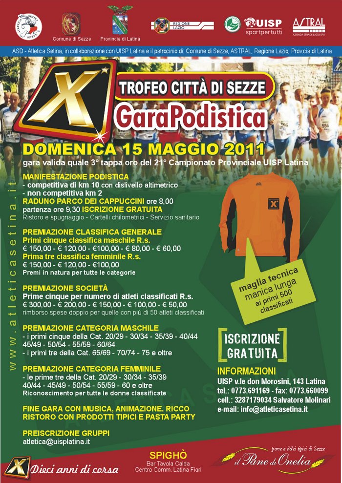 L'Atletica Setina è lieta di presentare la corsa podistica 10° Trofeo Città di Sezze di Km 9,6. La gara, giunta alla sua decima edizione , avrà luogo a Sezze (LT) domenica 15 maggio 2011 ore 9,30 con partenza ed arrivo in Viale dei Cappuccini. L'iscrizione è aperta sino a 30 minuti prima della partenza a tutti gli atleti, assoluti ed amatori, uomini e donne, che alla data del 14 maggio 2011 abbiano compiuto diciotto anni ed in regola con il tesseramento FIDAL, nonché coloro che dimostrino di essere tesserati con altra Federazione o Ente di Promozione Sportiva riconosciuta dal CONI e a tutti i tesserati che presentano all'atto dell'iscrizione idonea certificazione medica per attività agonistica. Sono previsti due ristori ai Km 4,5 e 9,0. Ricco ristoro a fine gara Il Servizio Medico è assicurato per tutta la durata della gara, così come l'assistenza della Polizia Municipale, della Protezione Civile e del Moto Club di Sezze. Il ritrovo è alle ore 8,00 presso L'Istituto Tecnico Commerciale nel Viale dei Cappuccini. La partenza è per le ore 9,30 La
