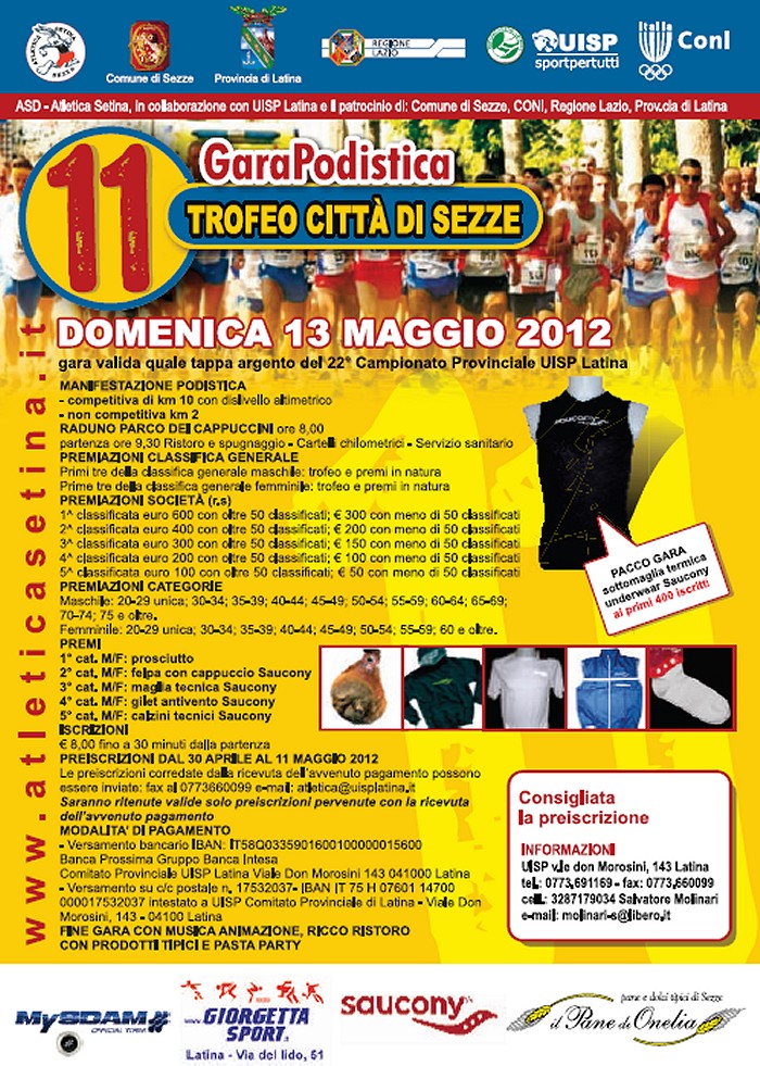 è lieta di presentare la corsa podistica 11° Trofeo Città di Sezze di Km 9,750. La gara, giunta alla sua undicesima edizione , avrà luogo a Sezze (LT) domenica 13 maggio 2012 ore 9,30 con