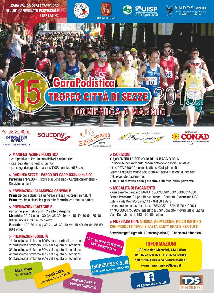 è lieta di presentare la corsa podistica 15° Trofeo Città di Sezze di Km 9,750. La gara, giunta alla sua quindicesima edizione , avrà luogo a Sezze (LT) domenica 8 maggio 2016 ore 9,30 con