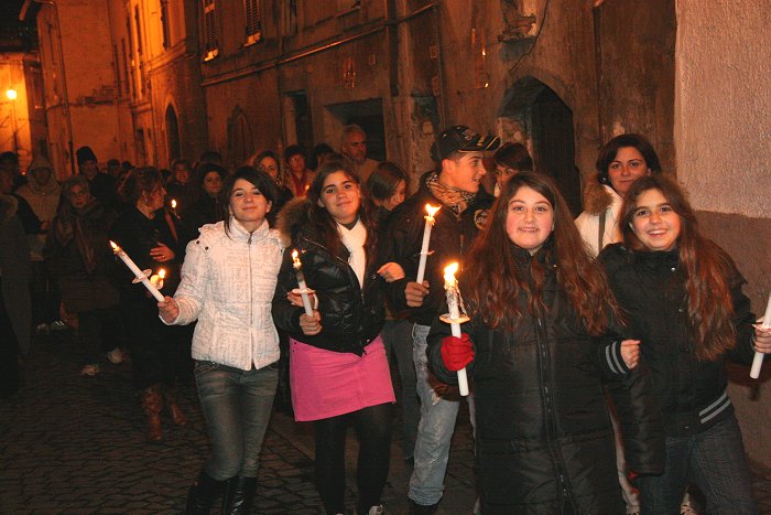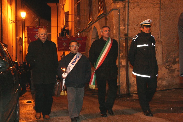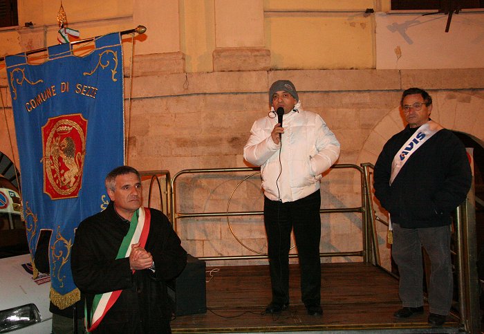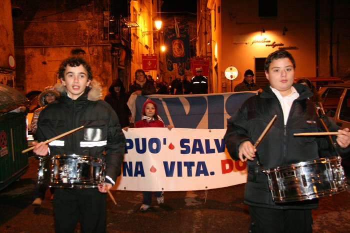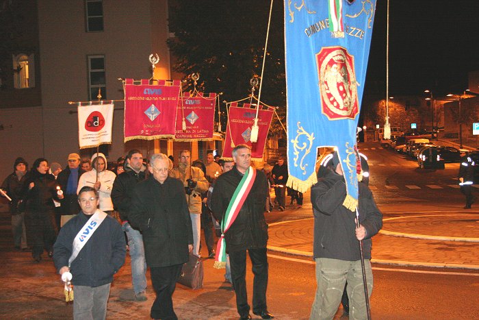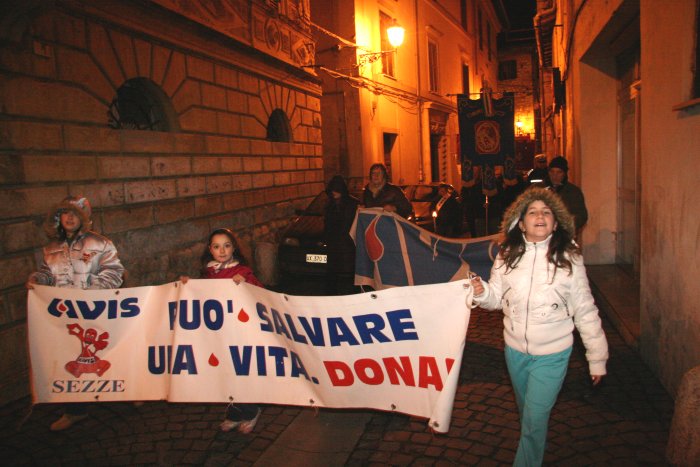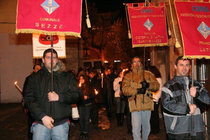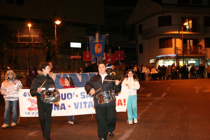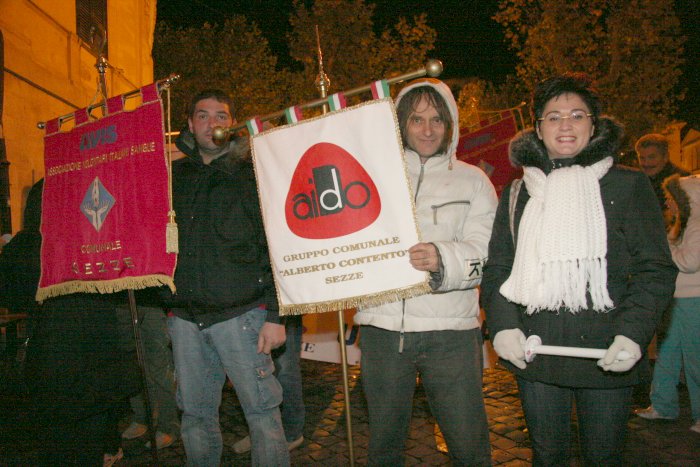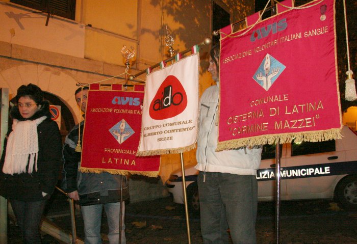 15 novembre 2007 Una manifestazione importante da ripetere L’Avis Comunale di Sezze in collaborazione con la locale sezione Aido ed i rispettivi presidenti, Ubaldo Brandolini e Maria Mele, hanno promosso una manifestazione di solidarietà in memoria di Alberto Contento e Salvatore Locarini. Giovedì 15 novembre nel centro storico di Sezze è stata organizzata la "1a Fiaccolata della solidarietà". Alle 20,30 un centinaio di persone, sfidando il primo freddo pungente, si sono radunate sotto le finestre del palazzo comunale dove è stata accesa una grande fiaccola. Il corteo, con in testa il gonfalone di Sezze ed il vice sindaco Umberto Marchionne, si è mosso da Piazza De Magistris con le fiaccole accese, gli striscioni e due rullanti che scendendo da Via Roma hanno sfilato lungo Via Corradini, Porta Pascibella, Via Marconi, Porta Sant'Andrea, Via San Carlo per risalire Via Roma e ritornare a Piazza De Magistris. Qui una piccola cerimonia ed un breve discorso del vice sindaco, preceduto dalla testimonianza toccante di Antonio Danieli, hanno concluso la manifestazione.