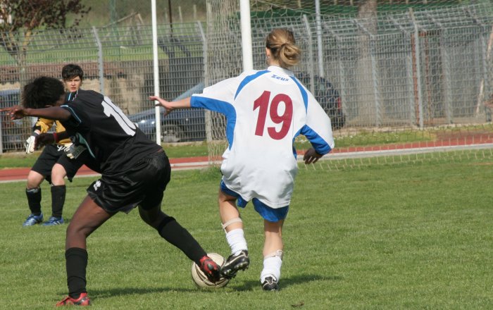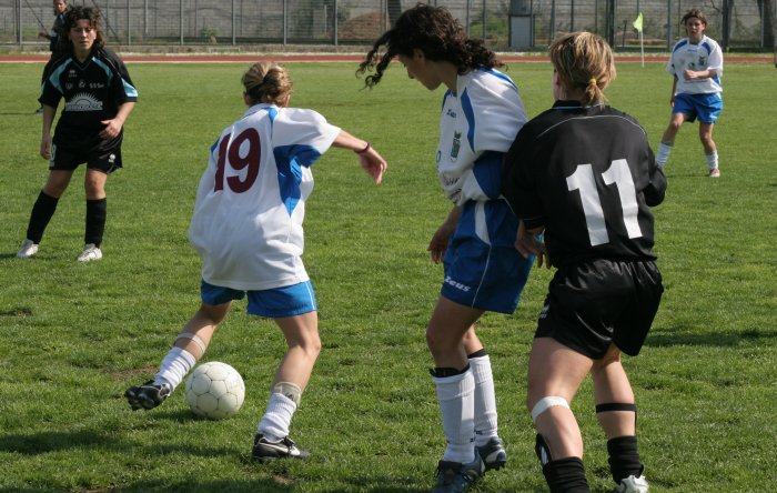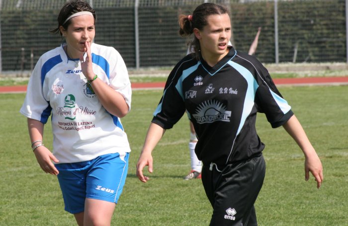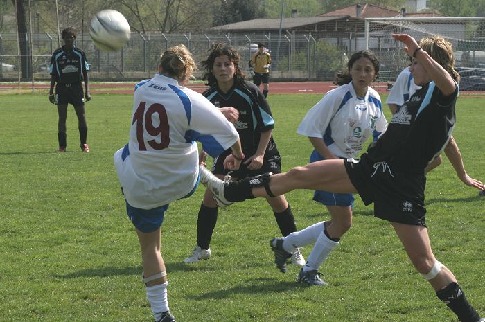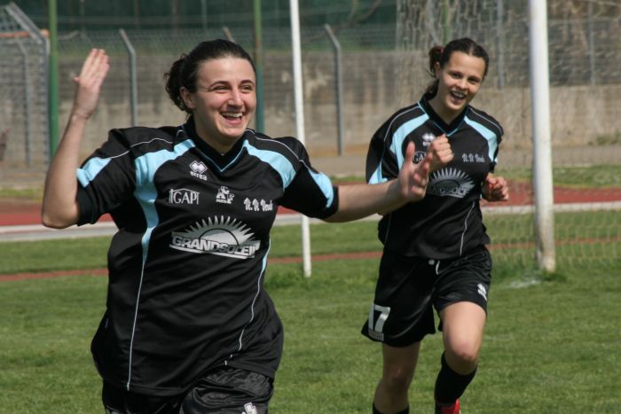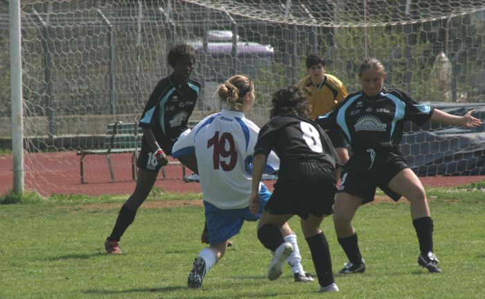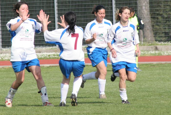 tre calciatrici in fuorigioco, va in rete con Cozzi e l'arbitro