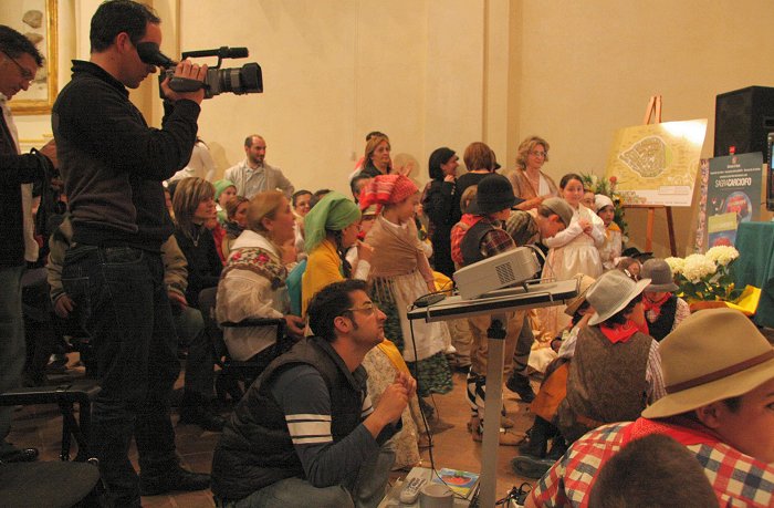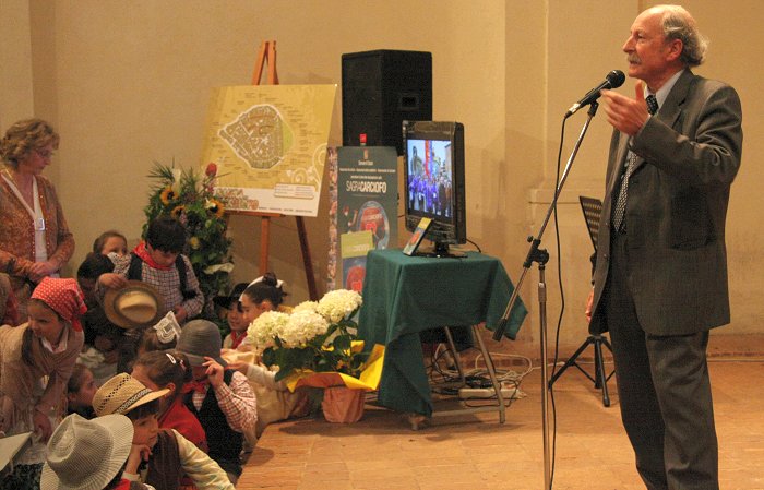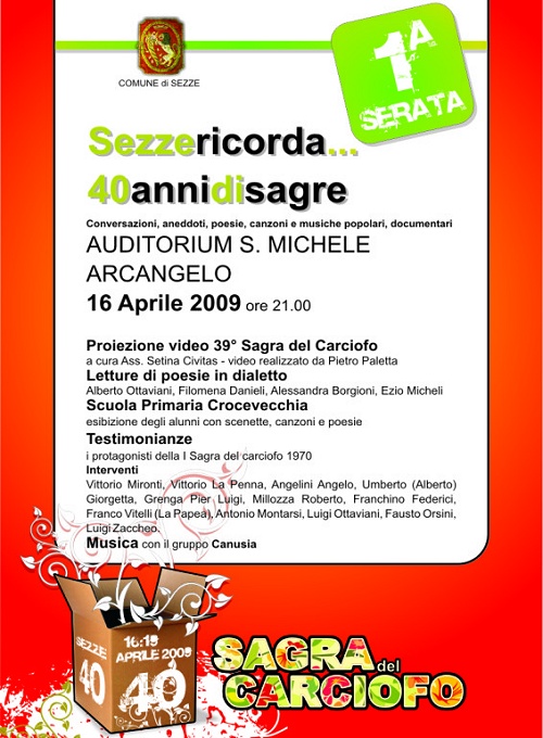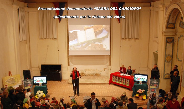 > Giovedì 16 aprile - Video e Poesia Giovedì 16 aprile si è aperta ufficialmente il programma della 40a edizione della sagra. Alle ore 21,00 l'Auditorium San Michele Arcangelo, stracolmo di gente e ci scusiamo con i tanti amici che non sono potuti entrare, c'è stata la prima proiezione del film della durata di 30' "Sagra del Carciofo" realizzato da Pietro Paletta a cura dell'Associazione Culturale Setina Civitas. Alla presentazione sono intervenuti il Sindaco Andrea Campoli e l'assessore alle Attività Produttive Sergio Di Raimo.