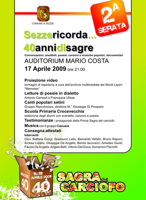 > Sabato 18 aprile - Spettacolo Sabato 18 aprile, i ragazzi delle Scuola Secondaria di Primo Grado “Pacifici e De Magistris” hanno organizzato un concerto che si terrà al Mario Costa. Domenica presso il Museo Archeologico verrà inaugurata la mostra fotografica dedicata ai quarant'anni della sagra. Nei trenta pannelli che compongono la mostra verranno esposte le immagini storiche a partire dalla prima edizione del 1970.