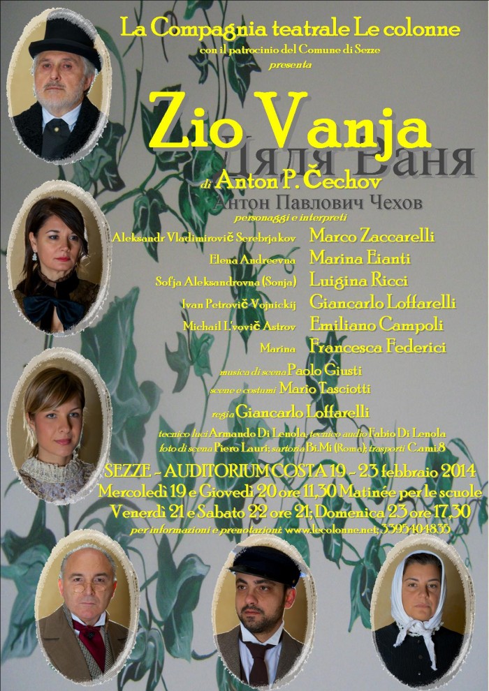 Interpreti dello spettacolo sono: Marco Zaccarelli (Serebrjakov), Marina Eianti (Elena Andreevna), Luigina Ricci (Sonja), Giancarlo Loffarelli (zio Vanja), Emiliano Campoli (Astrov) e Francesca Federici (balia); la musica di scena è stata composta da Paolo Giusti, le scene e i costumi sono firmati da Mario Tasciotti; tecnico audio è Armando Di Lenola, tecnico luci Fabio Di Lenola e fotografo di scena Piero Lauri. La regia è di Giancarlo Loffarelli. Il costo del biglietto è di 10 €., ma si possono acquistare due biglietti in prevendita al costo complessivo di 15 €. Ogni informazione è comunque disponibile sul sito: www.lecolonne.net.