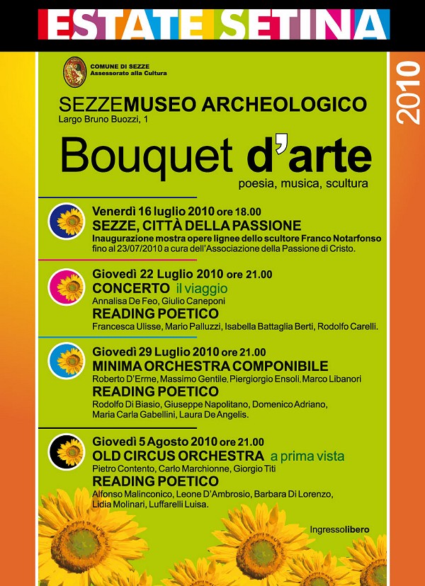 strutture del centro storico”. Il primo appuntamento è previsto per venerdì 16 luglio 2010, alle ore 18.00, con l’inaugurazione della mostra “Sezze, città della Passione”, a cura dell’Ass.ne della Passione di Cristo. Saranno eposte opere lignee dello scultore Franco Notarfonso. La mostra resterà aperta al pubblico fino al 23 luglio 2010. Giovedì 22 luglio, alle ore 21.00, si terrà il concerto “Il viaggio” con Annalisa De Feo e Giulio Caneponi, a cui seguirà il Reading Poetico con Francesca Ulisse, Mario Palluzzi, Isabella Battaglia Berti e Rodolfo Carelli. Ancora tanta buona musica con la Minima Orchestra Componibile, in programma per giovedì 29 luglio (ore 21.00). Ad esibirsi saranno Roberto D’Erme, Massimo Gentile, Piergiogio Ensoli e Marco Libanori. Previsto anche il Reading Poetico di Rodolfo Di Biasio, Giuseppe Napolitano, Domenico Adriano, Maria Carla Gabellini e Laura De Angelis. La rassegna “Bouquet d’arte” si concluderà giovedì 05 agosto con la Old Circus Orchestra in “Prima vista” (ore 21.00). A calcare il palcoscenco Pietro Contento, Carlo Marchionne e Giorgio Titi. Il Reading Poetico di Alfonso Malinconico, Leone D’Ambrosio, Barbara Di Lorenzo, Lidia Molinari e Luisa Luffarelli chiuderà la serata. Tutti gli incontri sono ad ingresso libero. Info: Museo Archeologico Comunale Largo Bruno Buozzi, 1