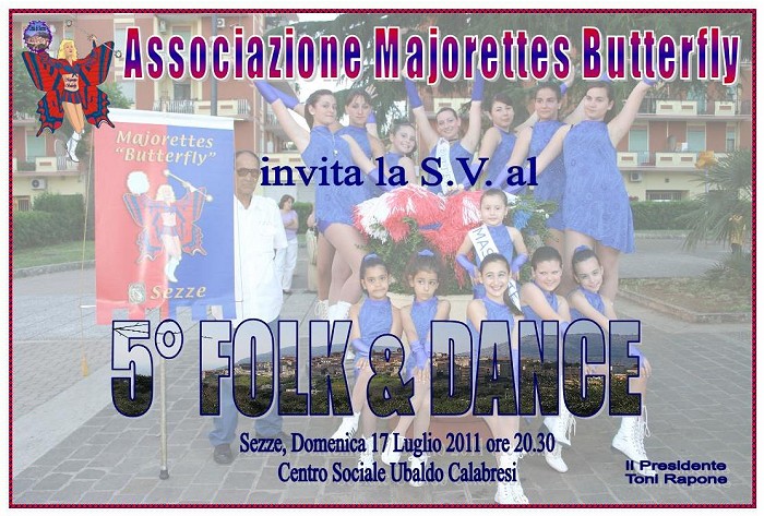 17 luglio 2011 ore 20,30 - Centro sociale U.Calabresi 5° edizione Folk and Dance L’Associazione Majorettes Butterfly di Sezze, in occasione delle manifestazioni dell'Estate Setina 2011, presenta la quinta edizione del «Folk and Dance», che si è tenuta domenica 17 luglio presso il Centro sociale Ubaldo Calabresi con inizio alle ore 20,30.
