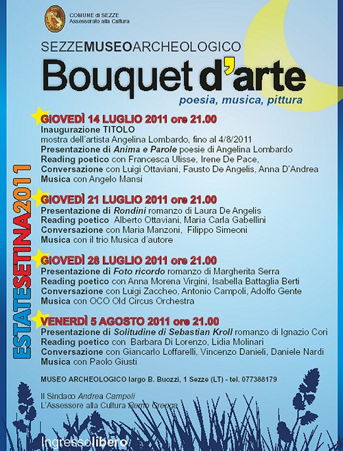 proiezione di sei film, dislocati tra Sezze e Sezze Scalo. Tra le novità introdotte già nel 2010 la seconda edizione della rassegna “Bouquet d’arte”, che prevede quattro incontri dedicati alla poesia e alla scultura. Il tutto sarà svolto tra le mura del suggestivo Museo Archeologico Comunale, antico palazzo rinascimentale della Procura un tempo adibito a carcere mandamentale. La rassegna è in continuità con l’iniziativa de I venerdì letterari, promossa lo scorso inverno dall’Amministrazione Comunale nell’ambito del Natale Setino, con l’obiettivo di valorizzare e promuovere le opere di autori locali e del territorio provinciale.