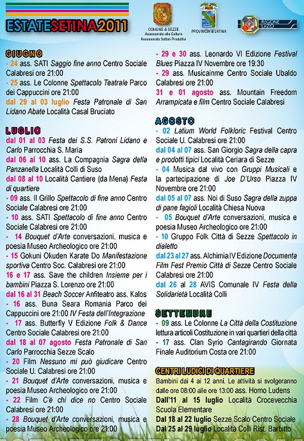 *** 1,2,3 luglio Festa dei Santi Patroni 9 luglio Saggio di danza "Il Grillo" dal 6 al 10 luglio 4° Sagra della Panzanella - Colli di Suso 15 luglio Gokuni Okude Karate Do - Centro Sociale Ubaldo Calabresi 17 luglio 5° Folk & Dance - Centro Sociale Ubaldo Calabresi 29 e 30 luglio 5° Festival Blues - Centro storico 2 agosto Latium World Folkloric Festival 10 agosto Gruppo Folk Città di Sezze "I Turapitto", spettacolo in dialetto dal 5 al 7 agosto 17° Sagra della Zuppa di pane e fagioli - Chiesa Nuova 17 settembre Finale del Cantagirando - Auditorium Mario Costa