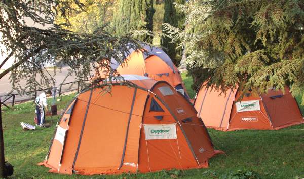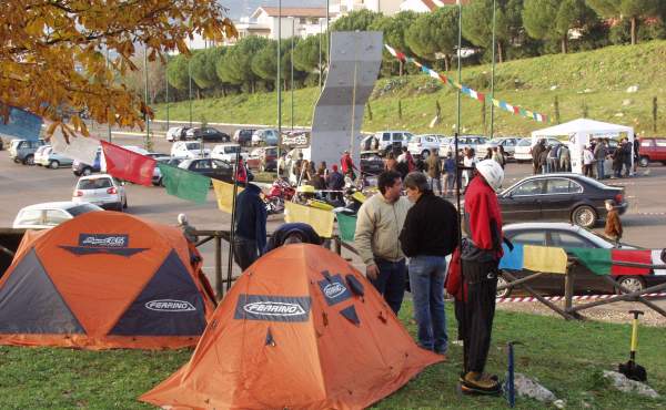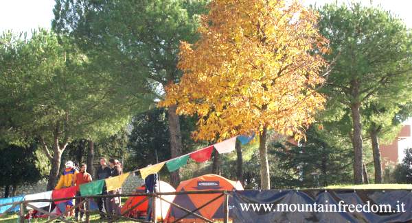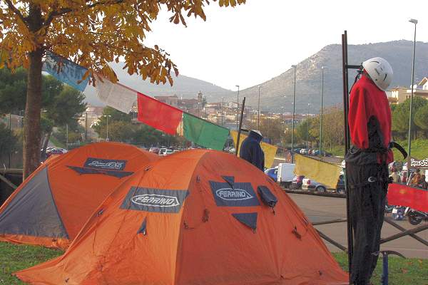 tende del campo base e sullo sfondo il profilo del centro storico di
