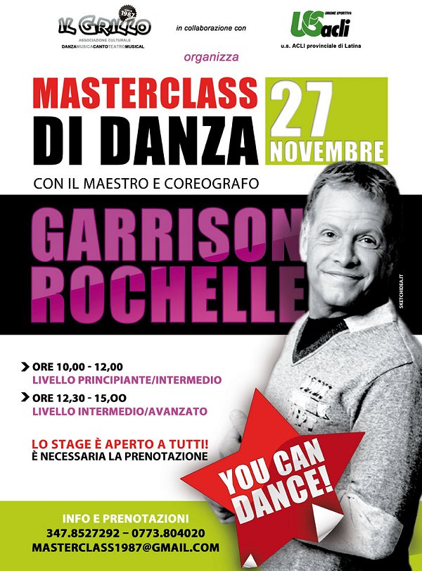 Domenica 27 novembre Sede "Il Grillo" in Via V.E. Orlando, 2 Sezze l'Associazione Culturale "Il Grillo" in collaborazione con le US ACLI provinciale di Latina organiza a Sezze un masterclass di danza con il maestro e coreografo Garrison Rochelle. Oltre a lavorare in diverse compagnie ed insegnare ai ragazzi di AMICI, Garrison tiene anche stage in giro per l’Italia presso scuole qualificate di danza. È questo un appuntamento importante ed unico a Sezze ed in provincia di Latina per tutti i praticanti della danza. Il masterclass è diviso in due livelli: >principiante/intermedio >Intermedio/avanzato