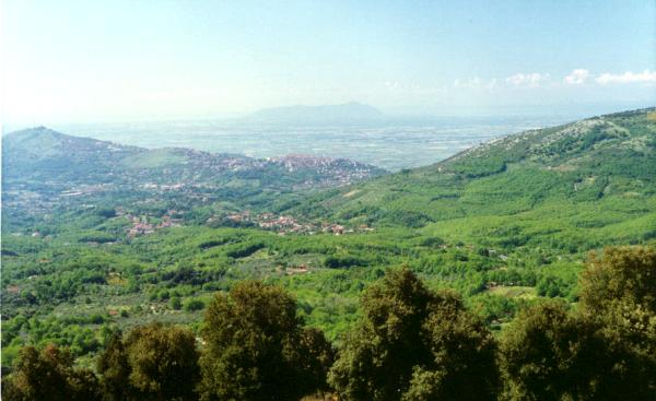 Da questo panorama preso dalle pendici del monte Semprevisa, si riesce a vedere la collina dove sorge il paese che divide la conca di Suso dalla pianura Pontina, mentre sullo sfondo c'é il promontorio del Circeo