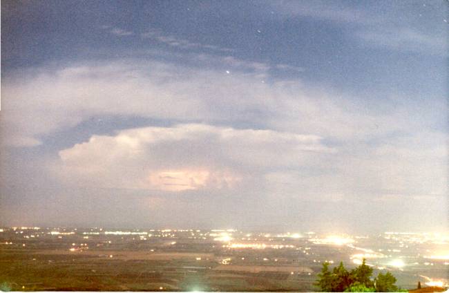 Temporale notturno sulla pianura, la lunga esposizione rende il cielo chiaro, ma i punti allungati che si notano in alto altro non sono che le stelle.